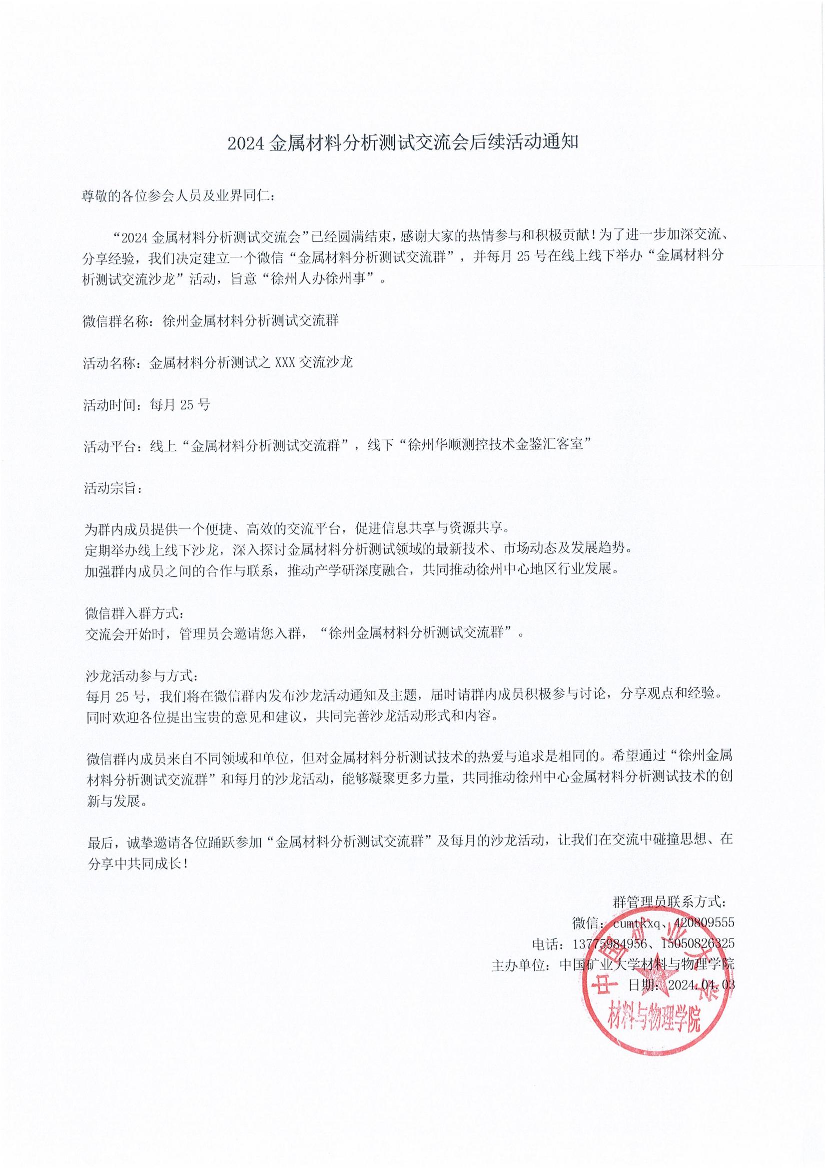 交流會開始時,管理員會邀請您入群,“徐州金屬材料分析測試交流群”。